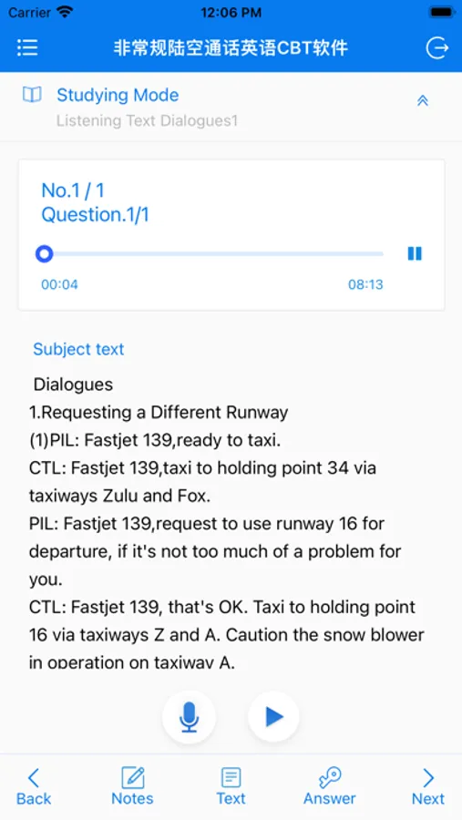 本APP旨在提高在职管制员应用管制英语的综合能力、使用管制员英语进行通讯的能力,以及使用管制员英语针对一些特情的处理能力;同时帮助提升在职管制员通过中国民航管制员英语等级测试的成功率。