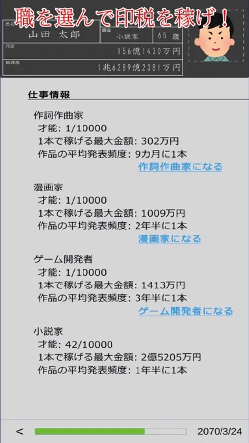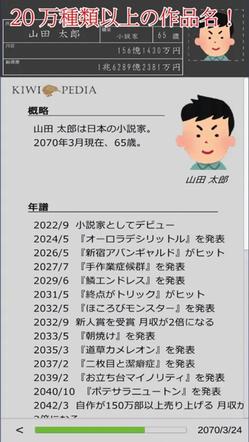 印税で総資産を増やす放置ゲームです。発表される作品名はランダムで選ばれ、全てで20万種類以上!ゲームを閉じている間も月収や総資産は増えます。
