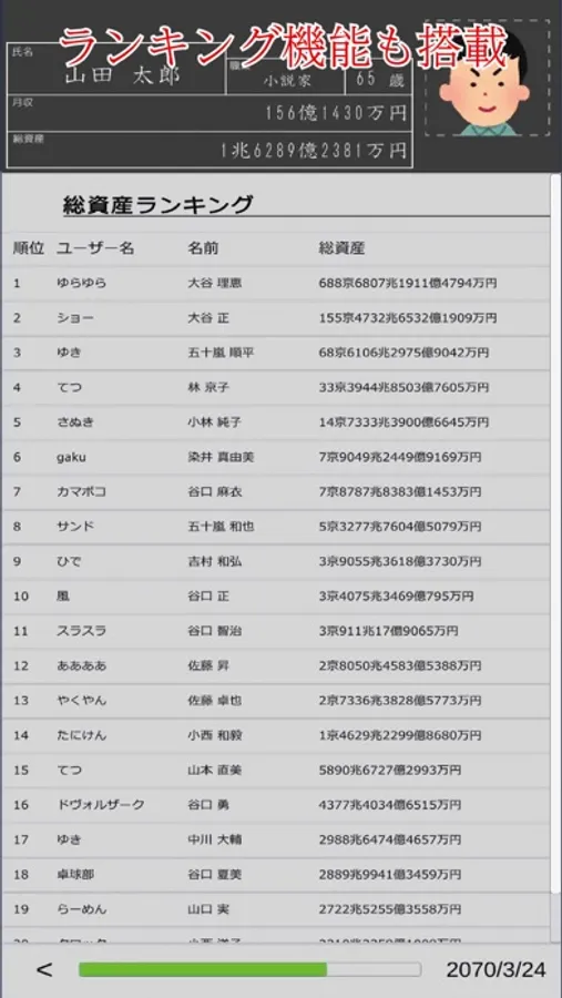 オンラインのランキング機能を搭載しているので友人や世界中の人と総資産額で競うこともできます。目指せ、世界ランキング1位!!