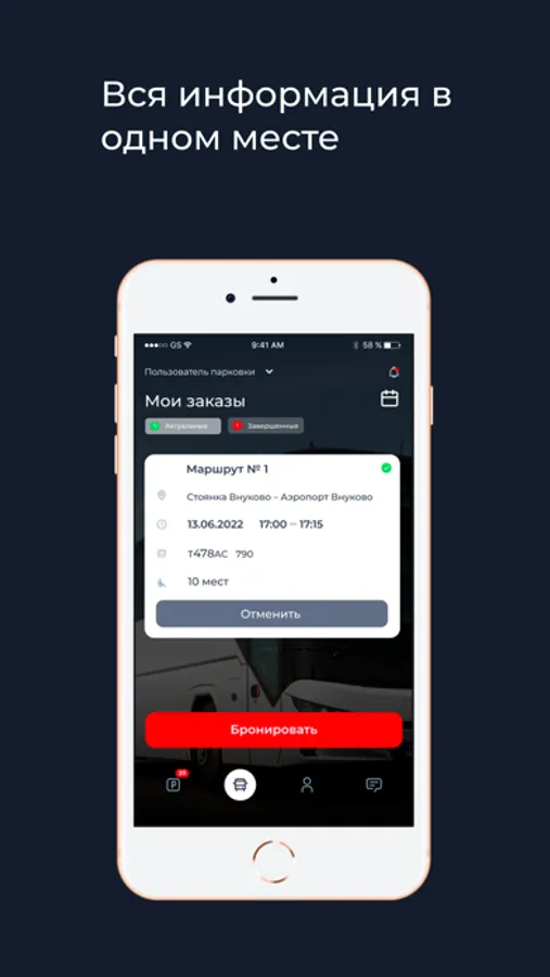 Бронирование парковочных мест и мест в шаттлах на доступных вашей организации локациях.