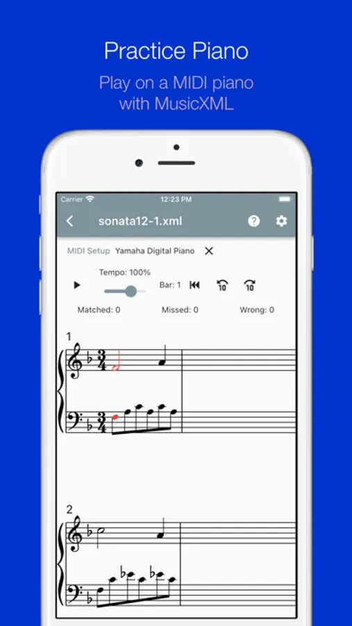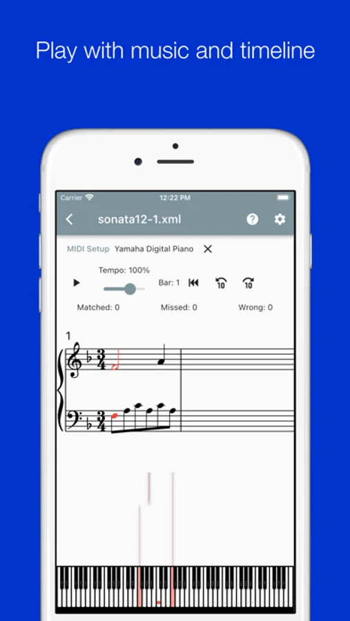 With a MIDI piano, You can play along with a MusicXML file and the notes you played will be compared with the correct notes and wrong notes are shown as you play