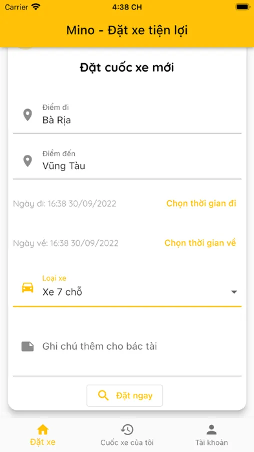 Chỉ cần vài thao tác đăng ký đơn giản để sử dụng Mino. Ứng dụng sẽ giúp bạn đặt các chuyến xe an toàn. Đội ngũ hỗ trợ và tài xế sẽ nhanh chóng liên hệ với bạn trong thời gian sớm nhất để xác nhận chuyến đi. Từ giờ, bạn không còn lo lắng về việc đặt xe!