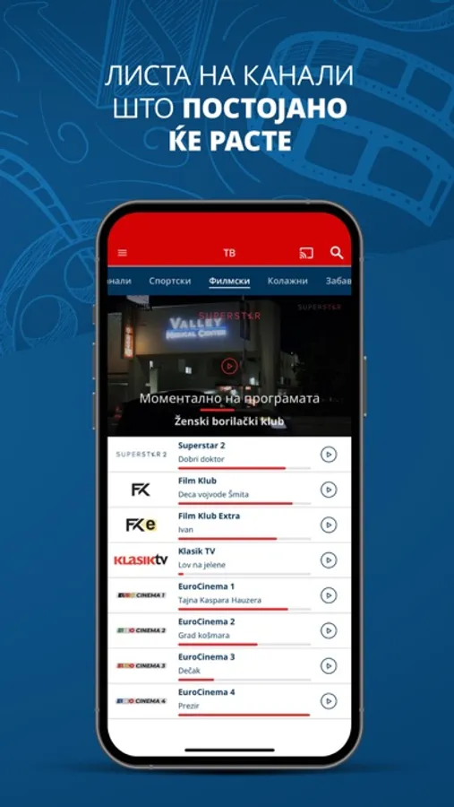 So mPLAY TV uzivajte vo videoteka so najdobrite regionalni serii i filmovi, kako i live TV prenos od najinteresnite kabelski kanali od Balkanot na edno mesto. Superstar, Toxic TV, Agro TV, K1, Balkan Trip, Euronews Serbia, Arena eSport se samo del od kanalite kade mozete da gi gledate najnovite filmski serii od produkcijata na Telekom Srbija, aktuelni muzichki izdanija, programi so vozbudlivi reportazhi od Balkanot, vesti od zemjodelstvoto i informativni nastani od poleto na kulturata i svetot.