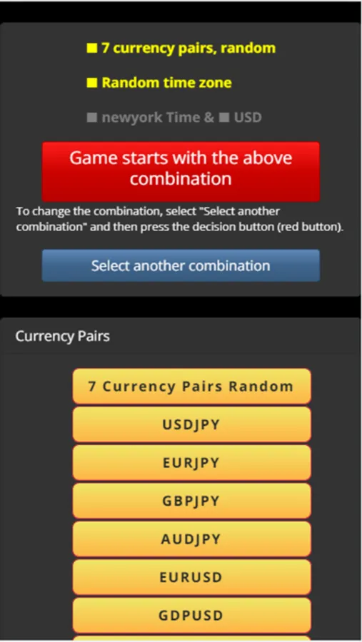 Seven currency pairs and five time zones can be selected at will. You can train with your favorite currency pair and time zone.