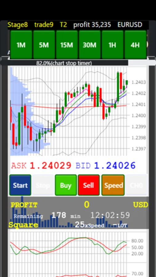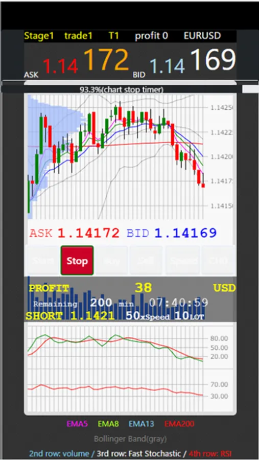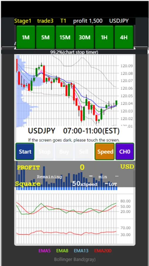 The game is full of game elements such as deviation values for each trade and rankings for each stage, as well as a glance display of candle charts from 1 minute to 4 hours, Bollinger Bands, EMA exponential moving averages, volume, fast stochastics, and RSI.
