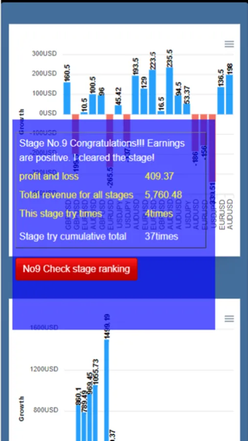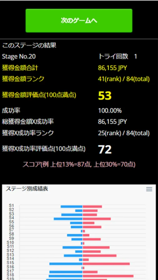 The "Stage Result" will be displayed after 20 trades. Stage ranking is calculated based on two factors: "absolute value ranking" and "absolute value/number of attempts required to clear" and is evaluated on a 100-point scale. (The top 12% will receive 88 points).