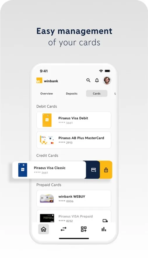 From the "Cards" section you can manage your debit, credit, and prepaid cards. You can also view the balances and transactions of your cards, make a card payment, block temporarily a card, issue a new card, set new card limits, manage card controls management and much more.