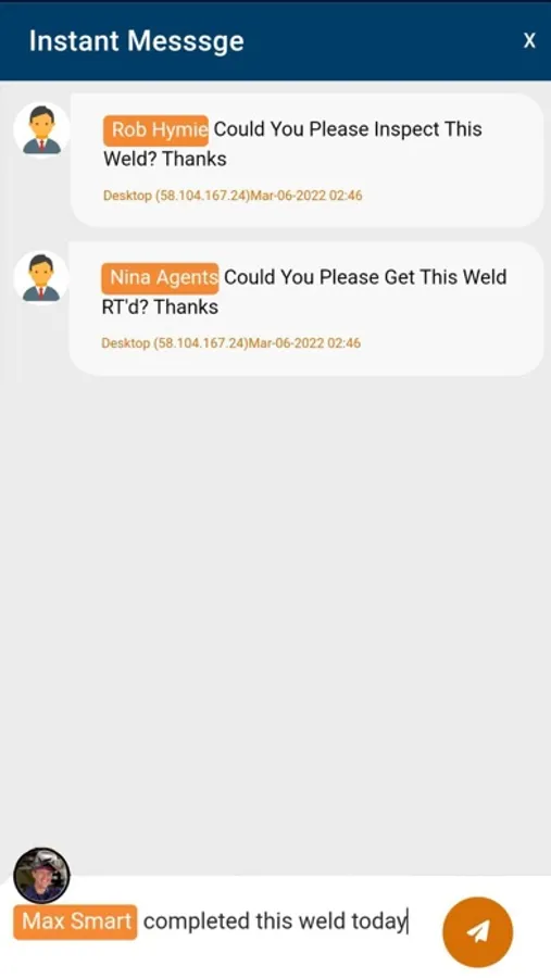 Welding inspectors can record visual inspection results of welds in the mobile app.