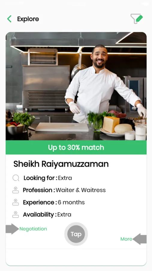 Just by swiping right you can apply and start negotiating to hire or getting hired. Swiping left will show you more options compatible to your demand.