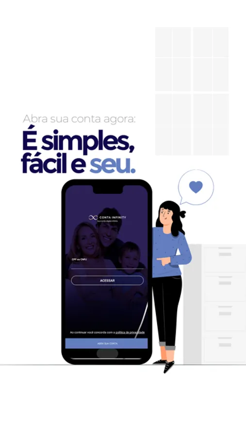 "Abra sua conta digital no Conta Infinity. Evoluímos cada vez mais para que você tenha a melhor experiência, O Conta Infinity oferece uma conta corrente completa e totalmente gratuita!