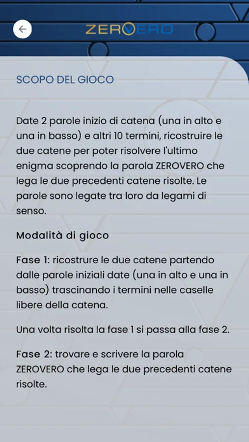 L’App Zerovero è un’estensione dell’omonimo format televisivo della Radiotelevisione Svizzera di lingua italiana. Si tratta delle CATENE CONCORSO un gioco che prevede di legare delle parole tra loro con legami di senso formando una catena.
