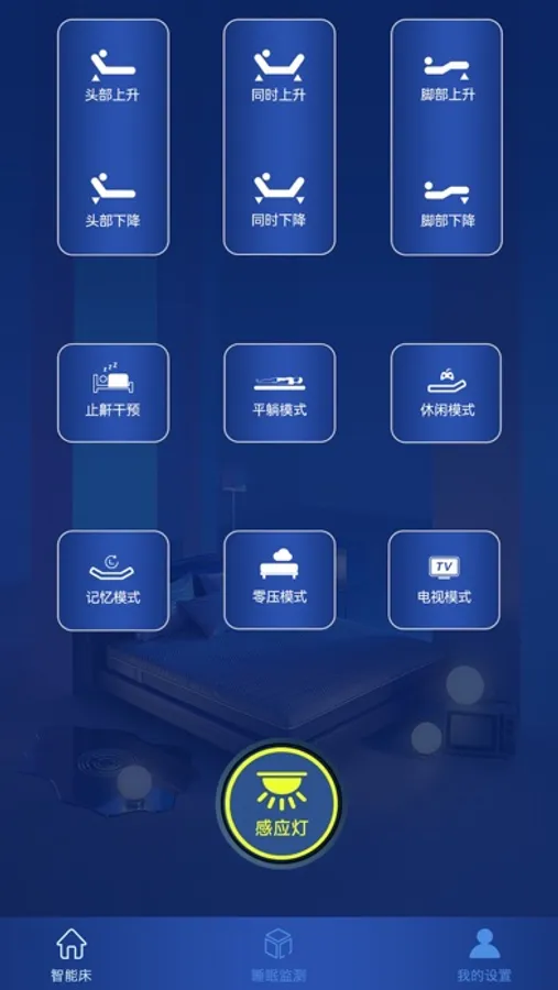 智能寝具APP是一款结合本公司的智能床,智能沙发设备的一款APP, 您可以通过该APP操作本公司产品智能床的头部抬起高度,脚部抬起高度,也可以设置相应的场景模式等等,使您有一个更舒适的生活体验。