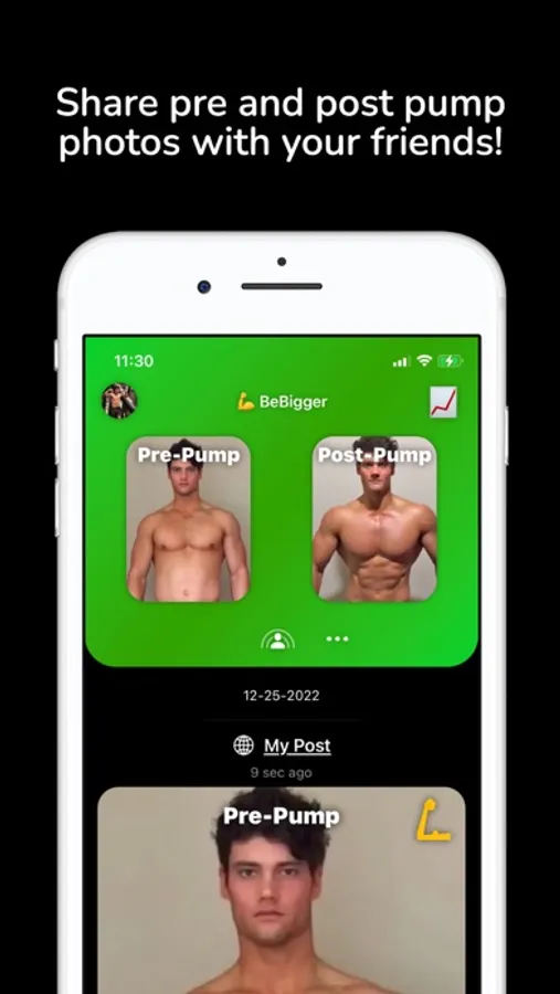 BeBigger is the easiest way to track your physique progress and share your gainz with your friends! Once a day, take a pre and post-pump photo and share it with your friends. All of your workouts are saved in the progress feature where you can see your physique progression over time!