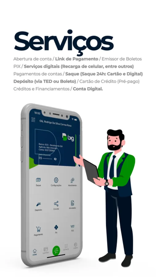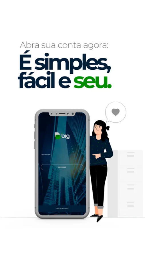 "Abra sua Big Conta Digital. Evoluímos cada vez mais para que você tenha a melhor experiência, O Big Conta Digital oferece uma conta corrente completa e totalmente gratuita!