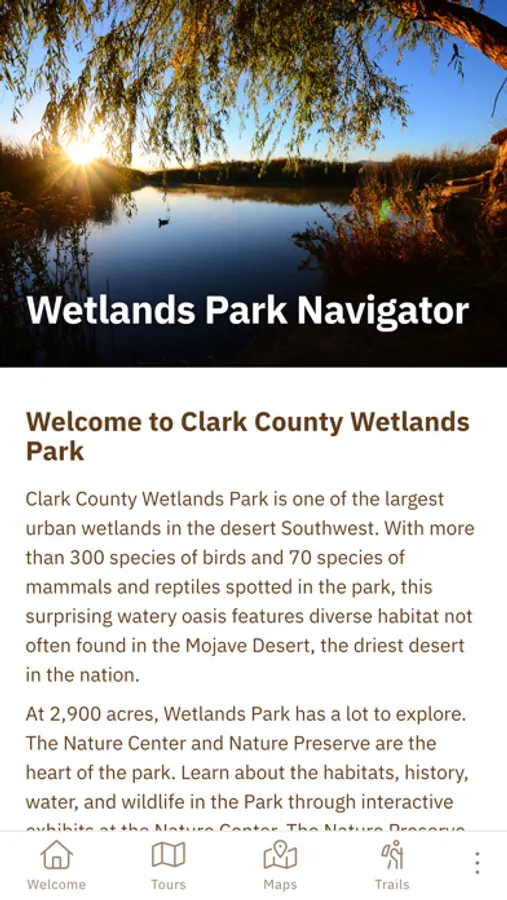 Wetlands Park is a 2,900-acre natural area containing both common and rare habitats in the Mojave Desert, including aquatic wetlands and riparian woodlands. With over 300 species of birds and 70 species of mammals and other wildlife, the Park is a hotspot for birders and animal enthusiasts of all kinds. Over 30 miles of trails for hikers, cyclists, and equestrians crisscross the Park and entice visitors to discover something new about the region. Six trailheads provide access to multi-use trails for hikers, cyclists, and equestrians. Many paved trails are ADA accessible.