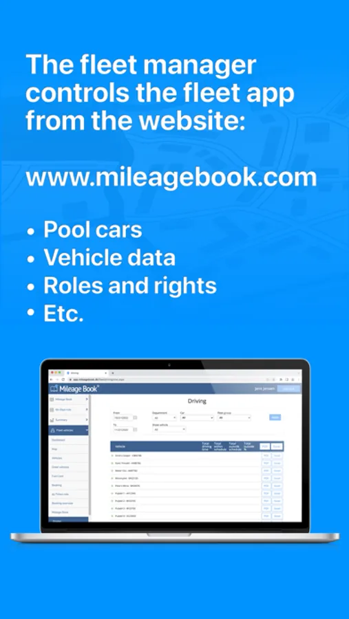Through the website, www.mileagebook.com,, the fleet administrator has full control over available vehicles in the app, prioritization of vehicles, which employees can see the location of the vehicles on the map, etc.