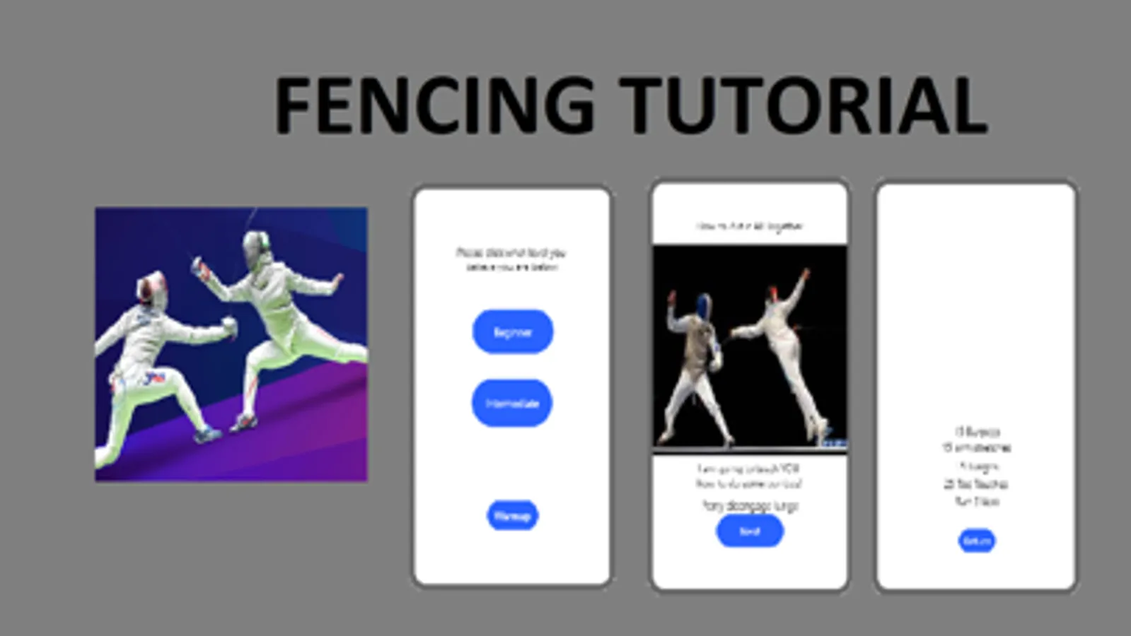 We aim to help users improve their Fencing skills. Select from 2 different difficulty settings and follow along for useful fencing tips!