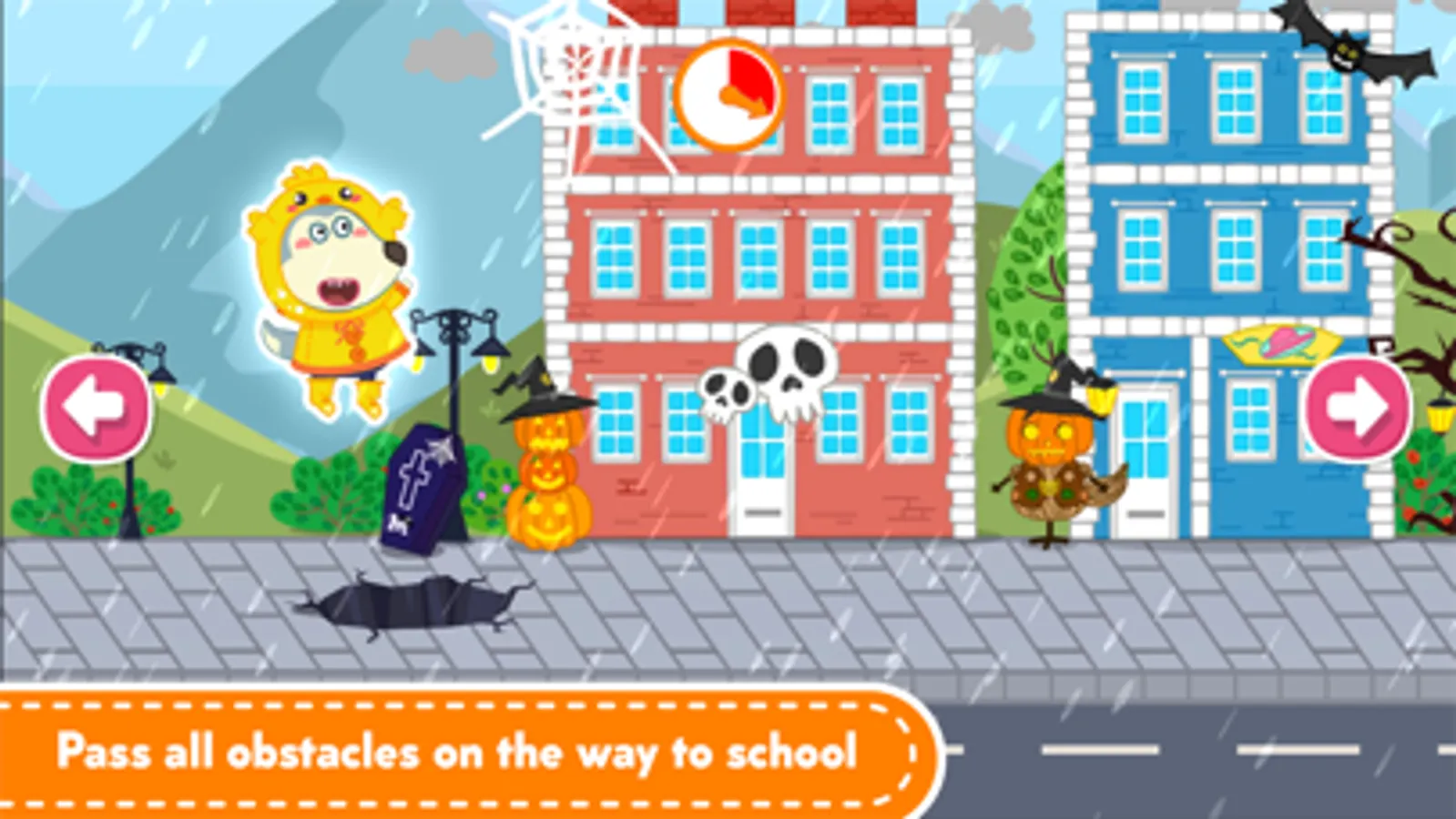 2. Go to Kindergarten: Help Wolfoo get to Kindergarten safely and within the allotted time so that you won't be late for school. You need to slow down when encountering puddles and avoid obstacles such as rocks, traffic poles.