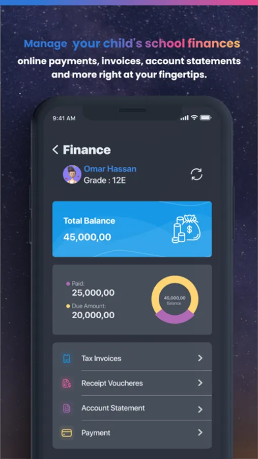 Parents can view their students' marks, exams, events, finance, etc...