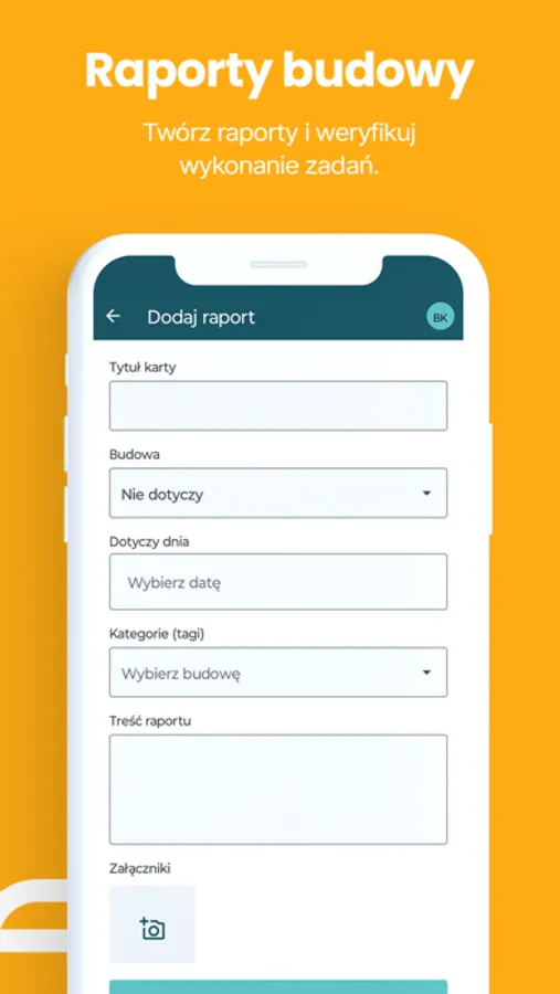 - Raporty budowy: Twórz raporty i weryfikuj wykonanie zadań;