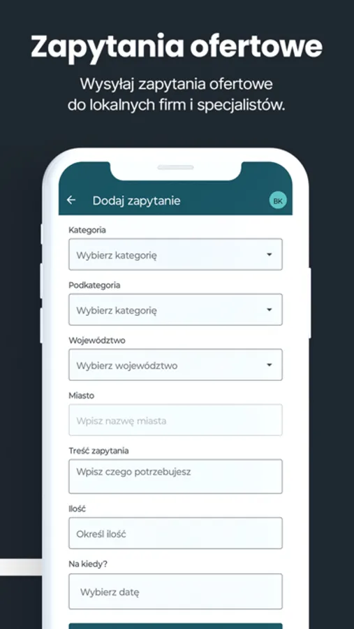 - Zapytania ofertowe: Wysyłaj zapytania ofertowedo lokalnych firm i specjalistów;