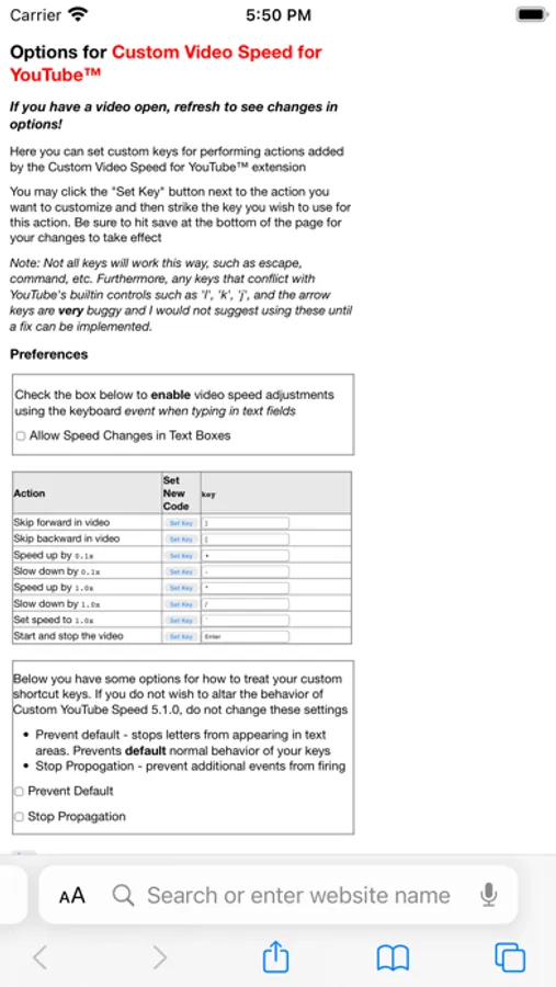 You can control the speed of YouTube videos using the pop-over on the extension or using keybindings on the keyboard. These keybindings can be customized in the options page or turned off all together if you don't like them.
