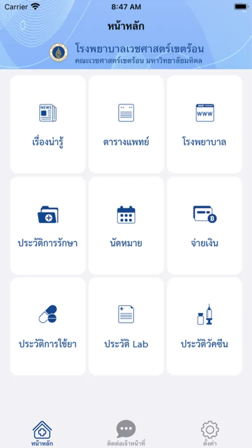 Official apps ของโรงพยาบาลเวชศาสตร์เขตร้อน มหาวิทยาลัยมหิดล สามารถลงทะเบียนผู้ป่วยใหม่ ตรวจสอบและสร้างการนัดหมาย และสามารถตรวจสอบข้อมูลสุขภาพต่างๆของคุณ และดูข่าวสารข้อมูลและสาระความรู้ทางสุขภาพของโรงพยาบาล