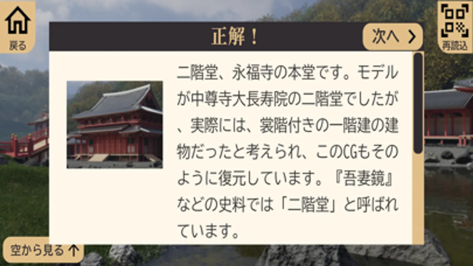 3. アプリ内で出題されるクイズに挑戦することが出来ます。クイズに回答することで、永福寺について更に深く知ることが出来るばかりでなく、博物館から帰った後でも、永福寺のVR画像をご覧になる事が出来る様になります(永福寺VR画像の開放)。是非、クイズに挑戦されて、解放された永福寺のVR画像をいつでも閲覧できるようにして、帰宅されてくだい。