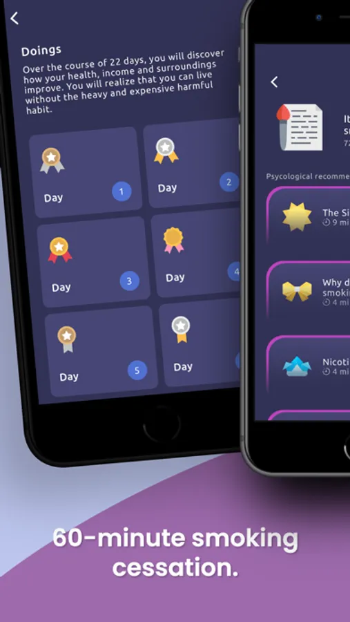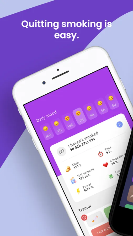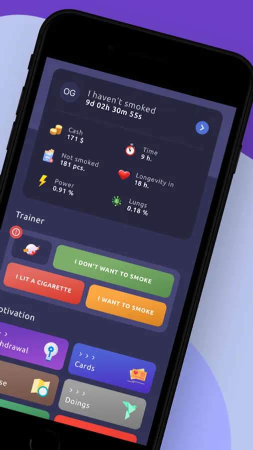 → Tracker that shows how much money you saved, how long you didn't smoke, how many cigarettes you didn't smoke, and how much health you're preserving.