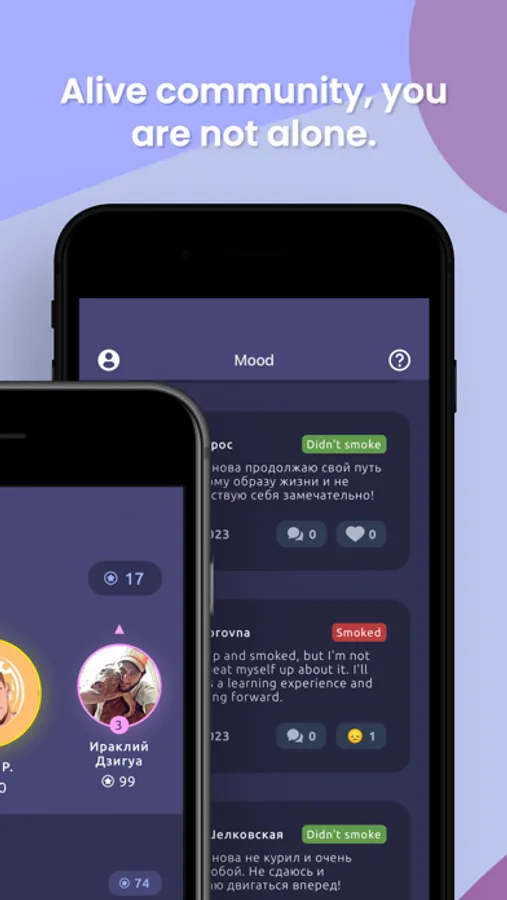 → If you can stay smoke-free, the app will encourage you with motivational messages and rewards in the form of coins and ratings. You'll rise to the top of non-smokers. You can also share your emotions on the newsfeed, to which all community members are subscribed. Here, you can leave comments, add emotions, and follow the success of other members.