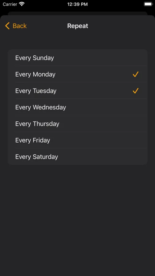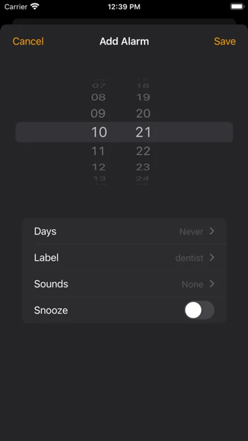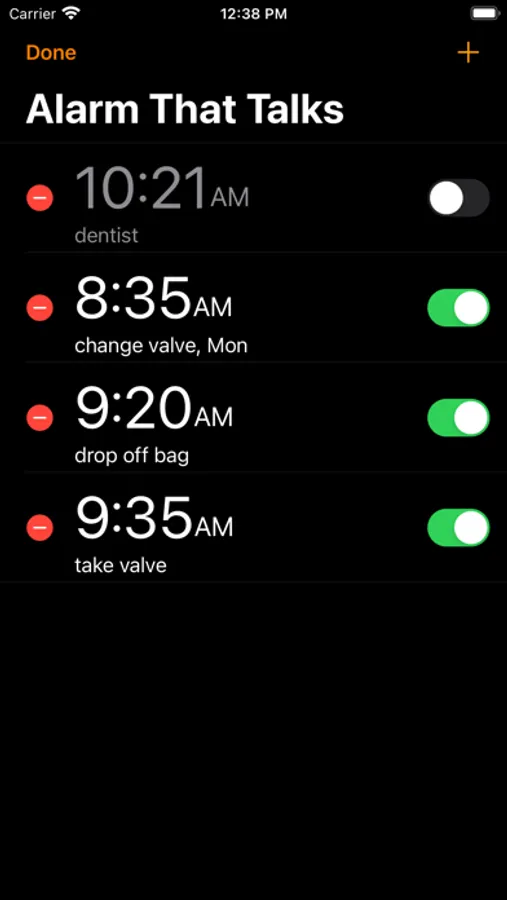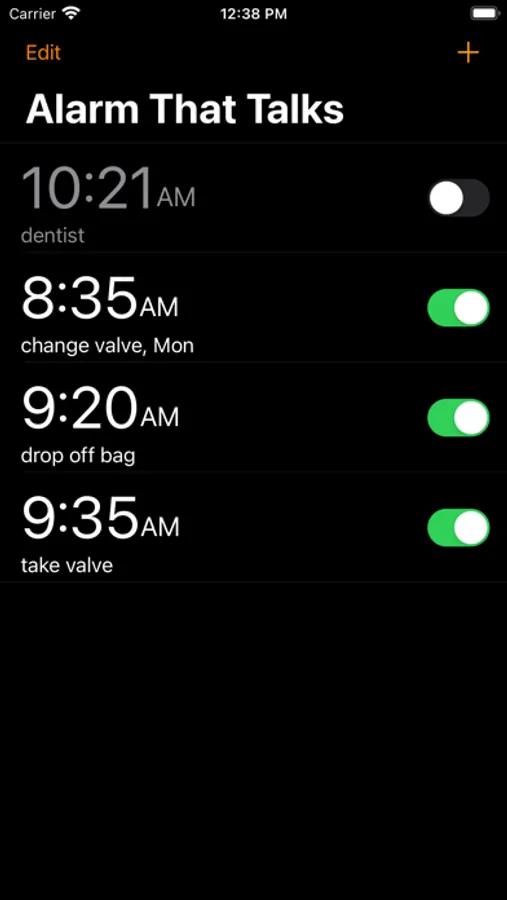 Our app has an interface very similar to iPhone’s Clock app to make it easier to use. You can set the day and time when you would like the alarm to sound. If you like you can make it play music just like in the regular iPhone alarm. However, if you choose “None” corresponding to “Sounds”, this app will speak the label you wrote.