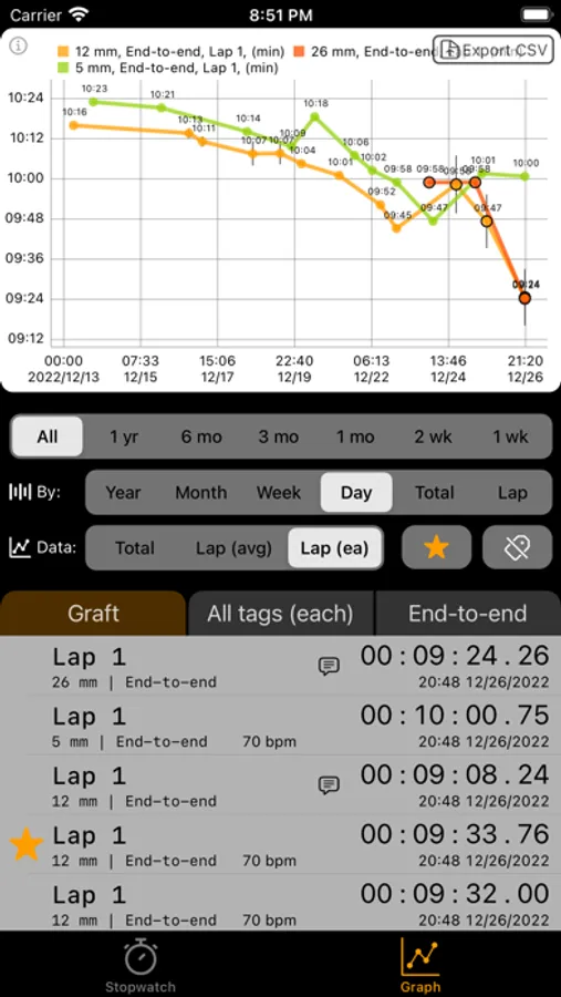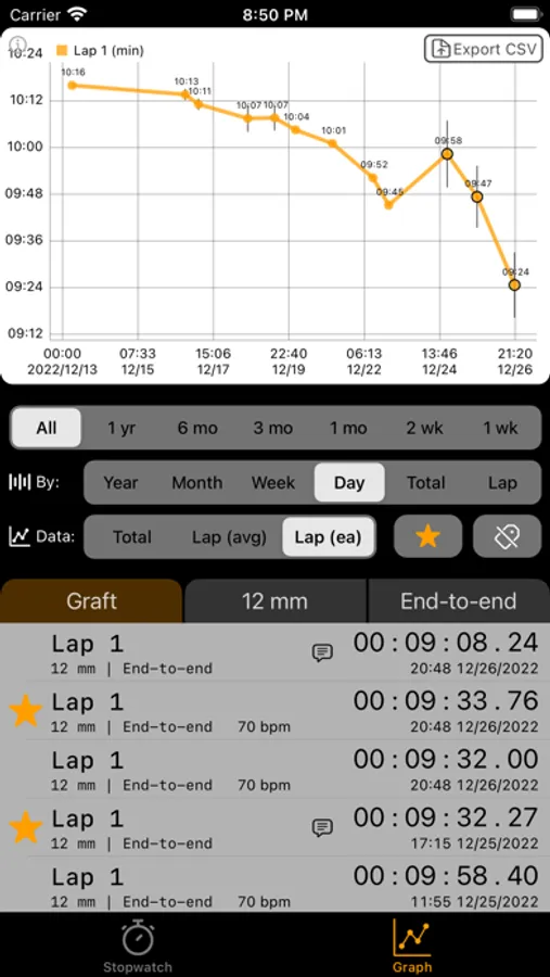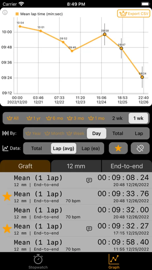 - Averages can be displayed by lap, day, week, month, or year.