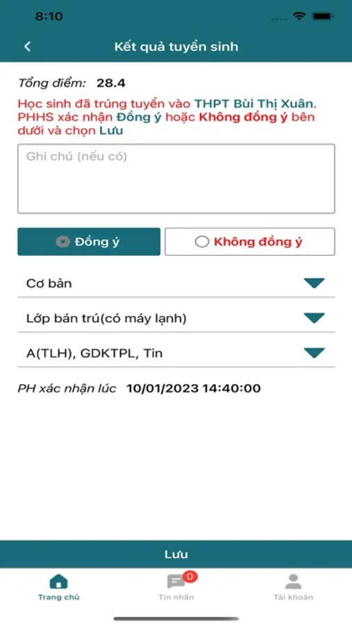 - Chọn trường vào lớp 10 cho học sinh.
