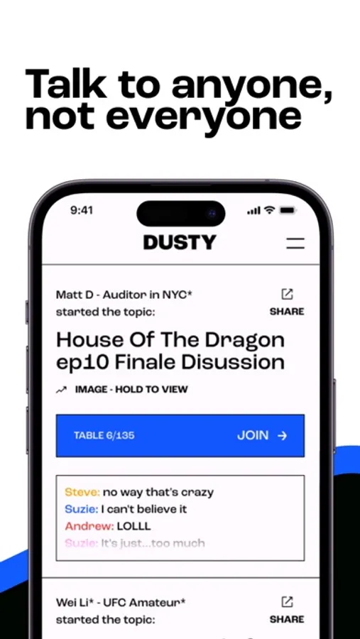 Rather than sift through an endless public feed of comments, Dusty breaks each topic into small rooms of 8 called ‘Roundtables’. Roundtables help you connect and move between random groups of 12 people so you can chat about your favorite shows, books, news or even during a live event in real time.