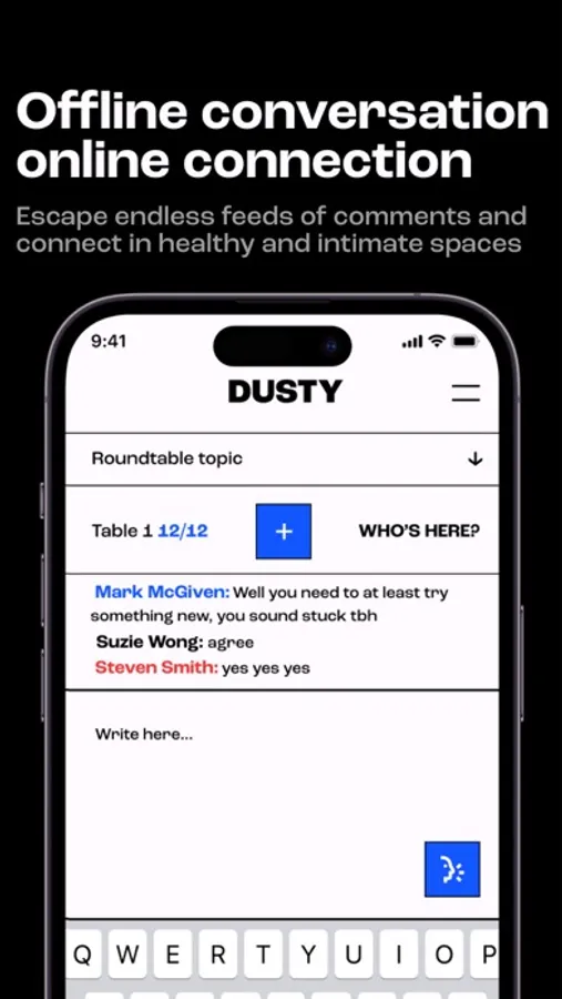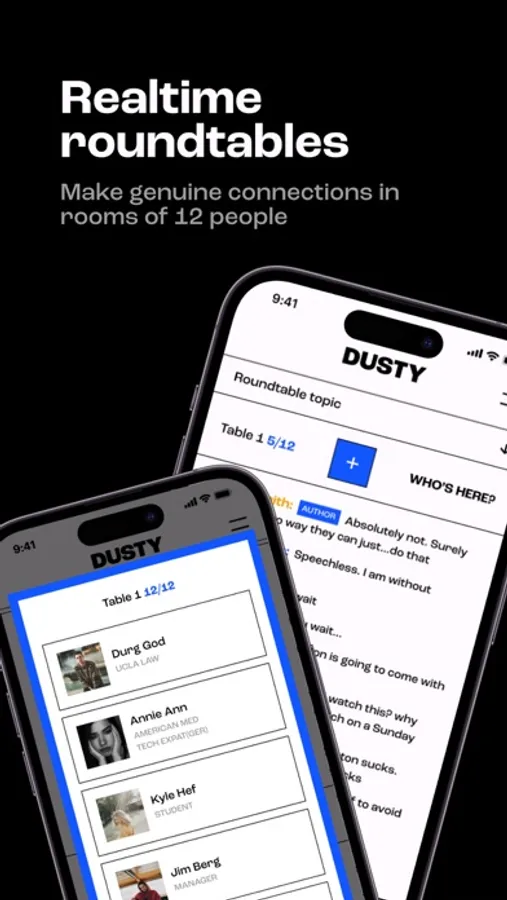 Dusty is a realtime social networking experience that connects people through live Roundtables of up to 8.