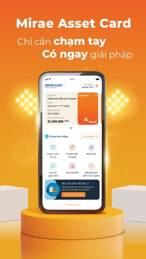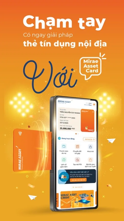 Owning Mirae Asset Card, customer can live at the fullest with the world of benefits and offers through wide ranges of different products from Mirae Asset Credit to other forms of credit card, MAFC NAPAS domestic credit card, co-branding credit card, etc