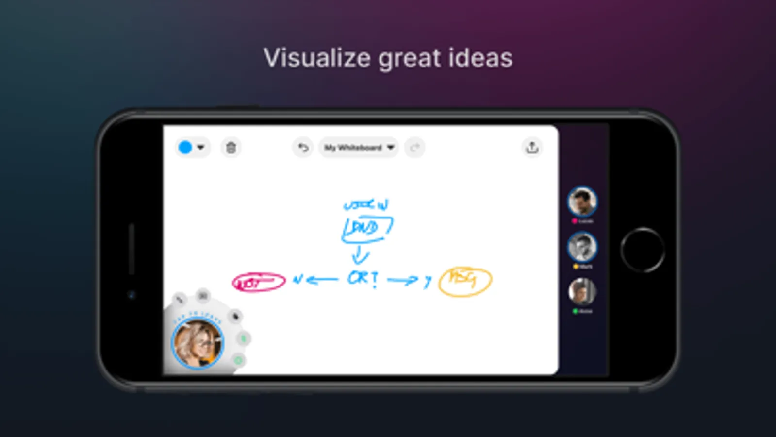 - Whiteboard: Quickly sketch, share and store ideas. And everyone can contribute simultaneously. Just like in the office days.