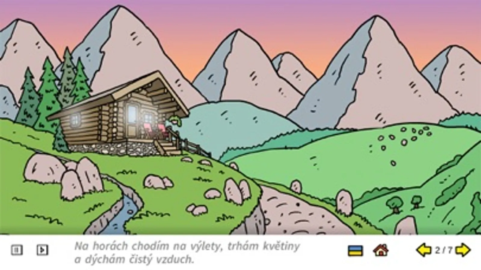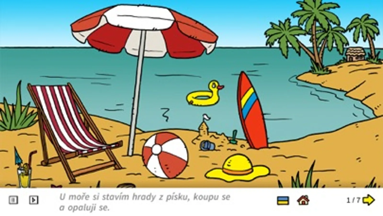 Hra obsahuje sedm ilustrovaných prostředí. Ke každému se váže krátký text, který je možné si znovu přehrát buď celý, nebo po jednotlivých slovech a zlepšovat si tak slovní zásobu.
