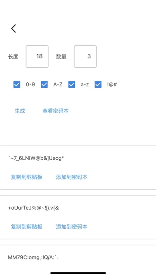 自动生成6-18位随机密码,添加到私有密码本保存。打开私有密码本需要二次确认,打开后可以修改密码标签,并将密码复制到剪贴板。