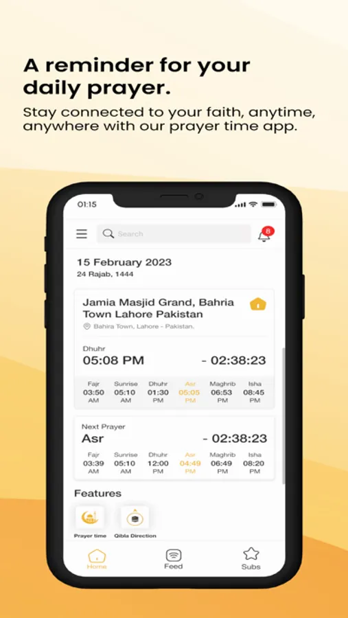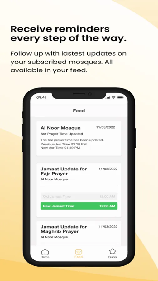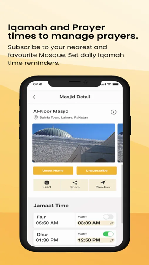 Jamaat provides an opportunity for us to be in sync with the Mosque’s Prayer or Jamaat timings at all times, with notifications alerting us if times change, so we never miss a prayer.