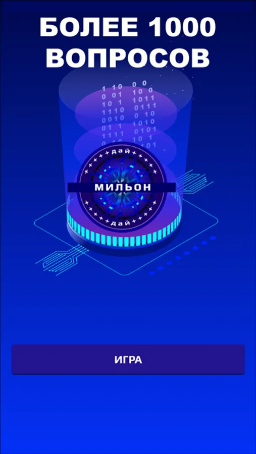 "Дай Мильон" - это викторина повторяет известную игру "Кто хочет стать миллионером". Все очень просто и привычно, наличие красивых спецэффектов и продуманного дизайна. Вас ждут более 1000 различных вопросов, понятные для русского брата: это советские фильмы, стихи, литература, пословицы, музыкальные исполнители, города, история, спорт и многое другое.