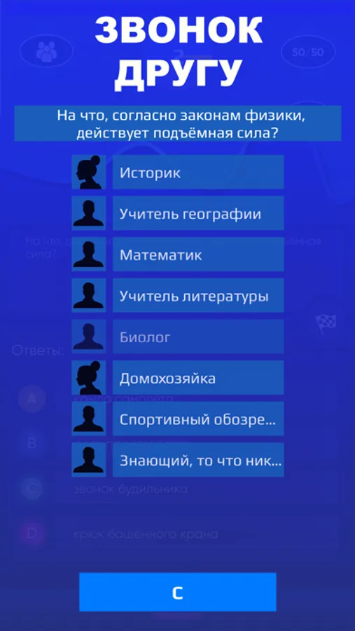 Если встретился сложный вопрос, то можно взять подсказку: 50x50, помощь зала и наконец звонок другу, который между прочим у вас не один, а целых 8. Каждый специалист в своей области.
