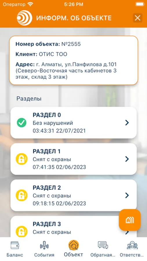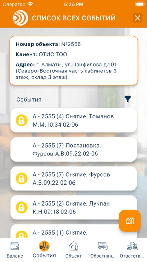 просматривать ленту событий: тревоги, снятия и постановки объекта на охрану;