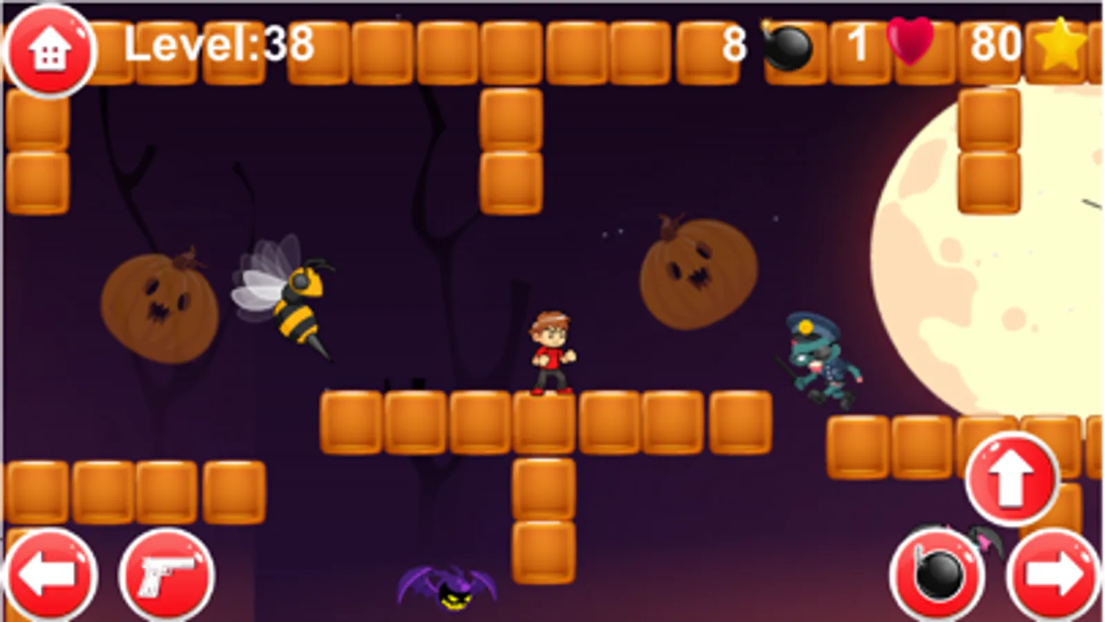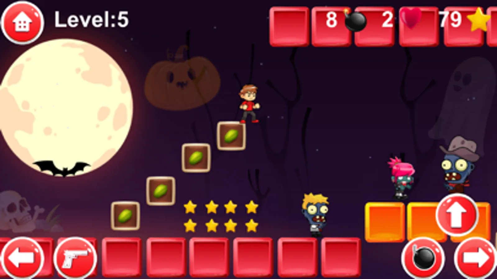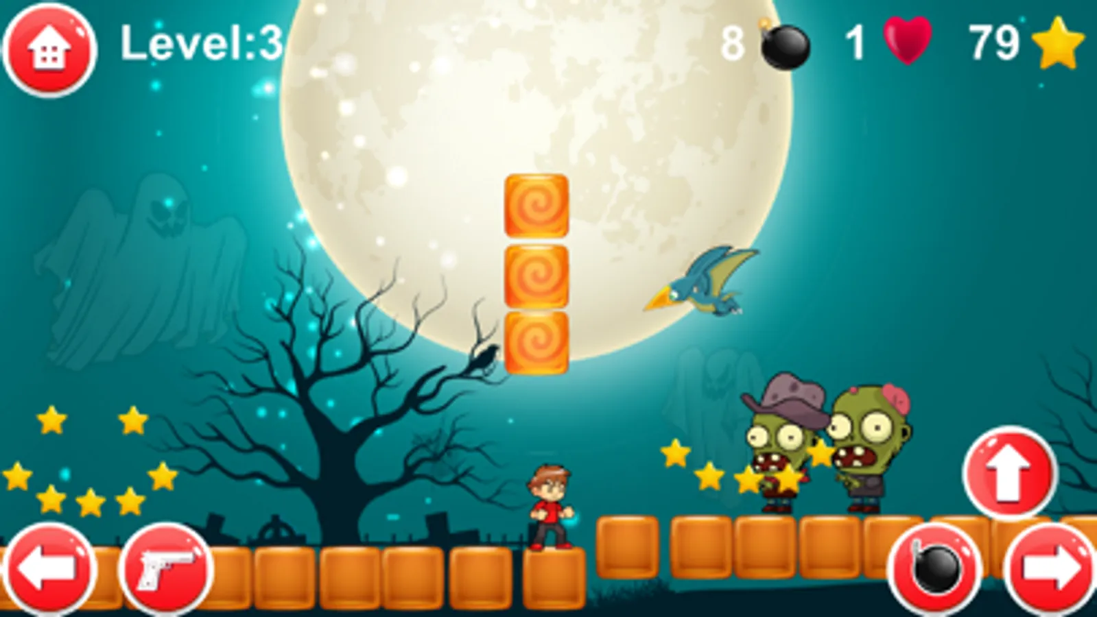 A zombie fire and bomb killer game. Your mission is just go home through a road with many awaiting Zombie. Kill them all or just avoid them to successfully got home safe. A kind of jump and run game but with many more interesting features. You can fire with unlimitted bullet. You can get bomb item to throw to the zombies or enemies along your way. There are walking and flying Zombie and creatures that you need to confront with. Try your best and pass all 55 levels.