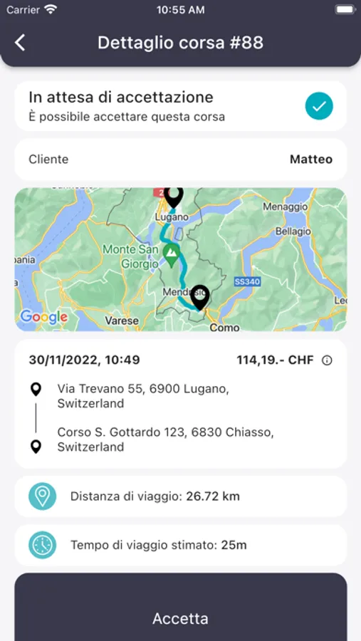 The driver, in addition to accepting immediate trips, will also be able to accept future trips having the possibility to manage them. In fact, he will be able to ask for more information from the customer thanks to the use of the chat as well as, if a problem arises, he will be able to cancel it.