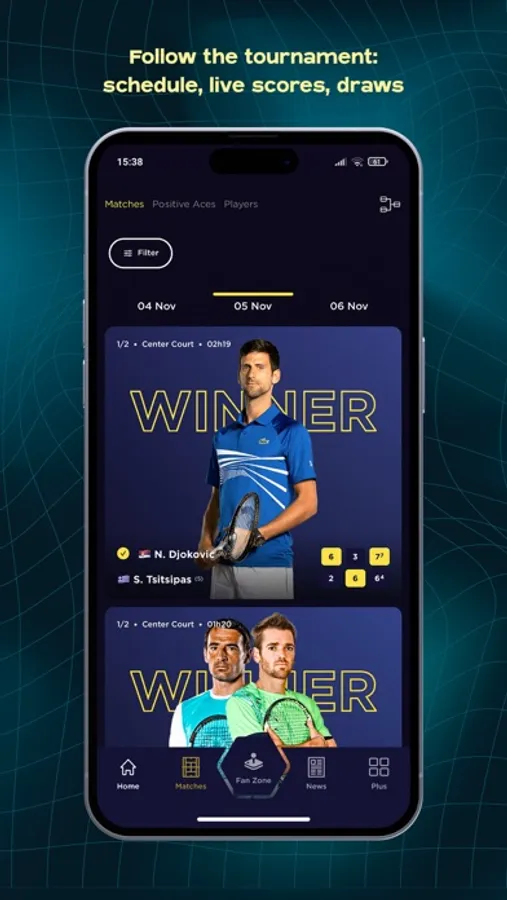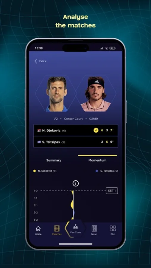 Find enhanced match pages. Who will win? Are we going to live a remarkable comeback? Dive into the heart of the game thanks to the Summary and Momentum metrics. Also find the schedule, live scores, draws and player profiles pages.