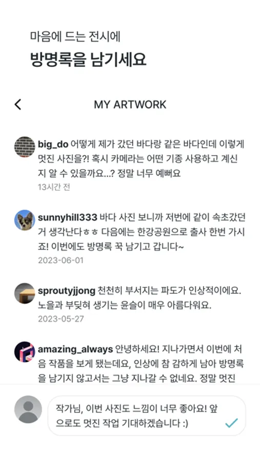 다른 작가님의 전시가 마음에 드셨나요? 플로어 우측 하단의 방명록을 작성해보세요!