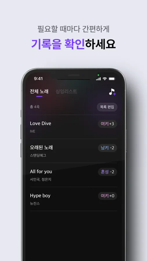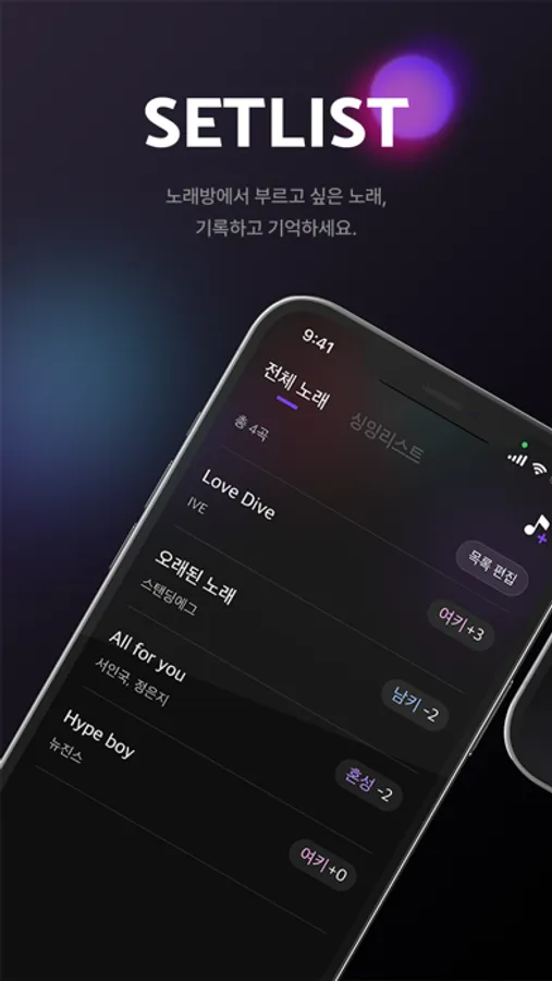 셋리스트는 가수의 키, 숙련도에 맞춰서 기록할 수 있어 여러분의 노래 경험을 훨씬 풍부하게 만들어줄거에요.