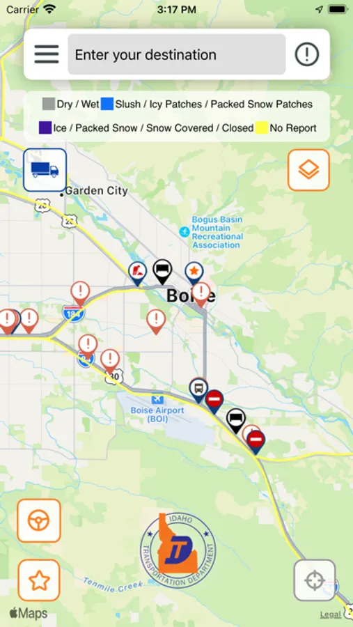 The Idaho 511 app provides near real-time highway and traffic information to drivers to help them safely plan their route. This includes information on construction, incidents, road closures, and weather alerts on roads across the province.
