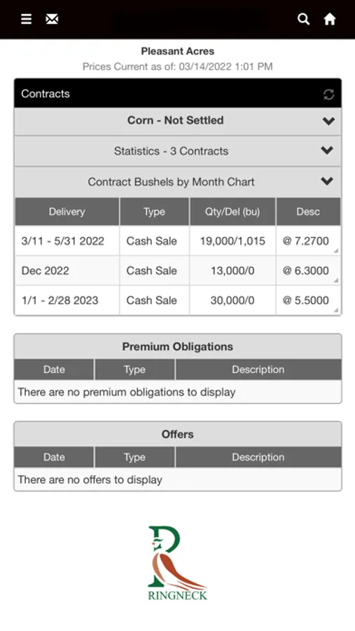 Track your scale tickets, contracts, and settlements plus monitor markets and cash bids right from your mobile device. Available for growers to download and use at Ringneck Energy.